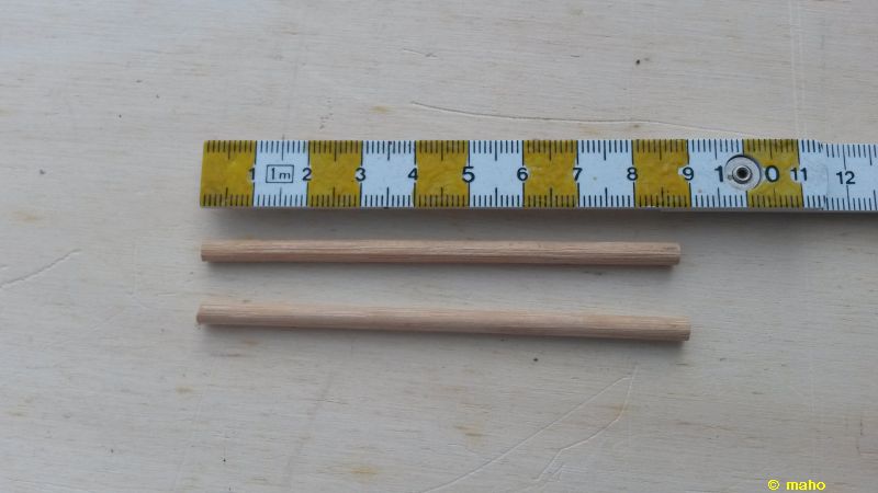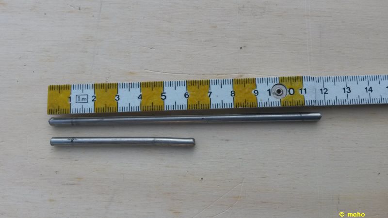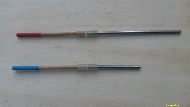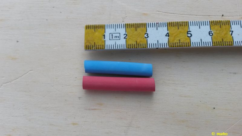 Nun zu den Stangen: das Rohmaterial gibt es ueberall in einschlaegigen Geschaeften zu kaufen. Die Stange besteht aus einem Nagel (133 mm x 5 mm, Baumarkt), Silikonschlauch (Conrad 229385), Schrumpfschlauch (rot / blau, Conrad 525895 / 525907) und Blumenstaebchen (4 mm, Baumarkt). Vom Nagel wird der Kopf abgetrennt (Säge oder Bolzenschneider). Die Blumenstäbchen auf die gewünschte Laenge schneiden (Säge, Seitenschneider). Dazu ein Stück (ca 2,5 cm) vom Silikonschlauch ablängen und den Schlauch auf die Enden von Nagel und Holz schieben. Als Sahnehäubchen habe ich auf die Enden der Stange zur besseren Kenntlichmachung noch ein Stück Schrumpfschlauch aufgeschrumpft. Hier kann man natuerlich auch Farbe einsetzen....und fertig ist die Torstange.