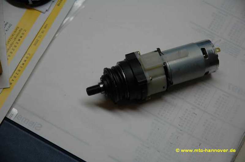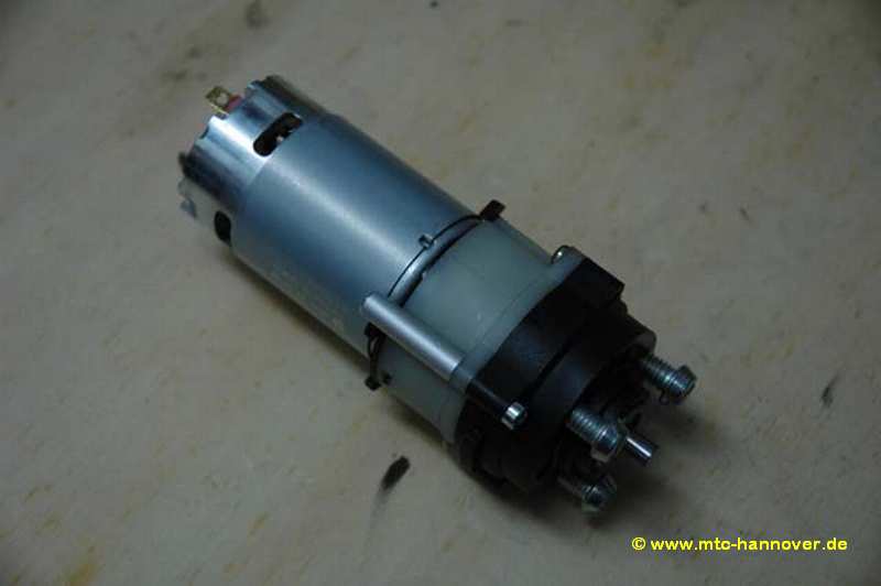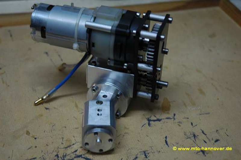 Was mir jetzt neben der Zeit noch fehlte, was ein passender Antriebsmotor. Da entschloss ich mich - wie viele meiner Trial-Kollegen zuvor auch - zu einem Akkuschrauber-Motor. Motor und 2-Gang-Getriebe habe ich über den Service als Ersatzteil für weniger als 35 Euro bestellt, nagelneu und ungebraucht. Zuerst habe ich den Motor in einer 7,2V-Version bestellt, später dann noch mal wegen Umrüstung der Lenkung auf einen RB35-Motor auf eine 12V-Version umgerüstet. Alles kein Problem dank der Webseite von Makita und den freundlichen Service-Mitarbeitern am Telefon. Das Getriebe muss noch ein wenig bearbeitet werden. Zuerst habe ich die Drehmomentbegrenzung mit Schrauben ausser gefecht gesetzt. Später (nach der direkten Montage am Zwischengetriebe) ist diese Stufe dann gänzlich der Säge zum Opfer gefallen. Die abgehende Welle ist zur Aufnahme eines Bohrfutters konzipiert (ist ja auch logisch, ist ja ein Akkuschrauben :-). Da das Teil aber so herrlich oberflächengehärtet war, konnte ich mit Bohrer oder Drehmeissel nichts besehen. Nach etlichen Versuchen hab ich das Bauteil durch einen Eigenbau aus Alu ersetzt, mit einer Abgangswelle mit 6 mm Durchmesser. Zuerst war dort ein Kardangelenk montiert, jetzt sitzt das Akkuschrauber-Getriebe direkt montiert an einem Zwischengetriebe. Im ersten Versuch hatte ich ein Verteilergetriebe gebaut, das direkt auf der Vorderachse montiert war und 1:1 übersetzte und der Motor im Heck des Trialers saß. Nach den ersten Fahrtests erwies sich aber die Untersetzung der Achsen mit 20:1 in Kombination mit dem Akkuschraubergetriebe als etwas zu langsam. So wurde die Motor-Getriebe-Kombination dann über ein neues Zwischengetriebe direkt auf die Vorderachse (tiefer Schwerpunkt) montiert. Das neue Zwischengetriebe ist mit Zahnräder im Modul 1 bestückt, besteht aus gefrästen Kohlefaserplatten (Dank an Torsten und Thorsten und dem unbekannten Fräser) und setzt die Geschwindigkeit um den Faktor 2 hoch. Die Kraft reicht damit noch lang hin...