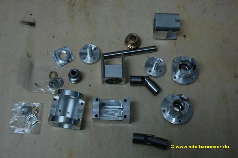 Fehlen jetzt noch zwei wichtige Komponenten: die Achsen und Zeit! Zeit ist definitiv Mangelware, also erst mal um die Achen gekümmert. Die Achsen stammen aus der Feder von Andreas Behrens, der Diese in Zusammenarbeit mit Gerald Träbing und Joachim Niechoy (alle zusammen bilden die Göttingen-Connection :-) konstruiert und kontinuierlich verbessert hat. Andreas hat die Pläne zur Verfügung gestellt - vielen Dank! Die Achsen bestehen aus einigen Dreh- und Frästeilen, die zusammen mit Schnecken-Trieben von Mädler zusammengebaut werden. Zum Drehen und Fräsen von drei Achsen braucht man...Zeit. Die war/ist nicht wirklich vorhanden und so nutzte ich die Gelegenheit, die Achsteile über Axel Hoff vom Profi herstellen zu lassen. Eine gute Entscheidung, denn die Teile sind wirklich sehr passgenau. Jetzt also noch den anderen "Kleinkram" wie Zahnräder, Schnecken, Lager, Schrauben und Achswellen bestellt und schon konnte die Montage losgehen. Die Schnecken habe ich in der Untersetzung 20:1 gewählt. Im Nachhinein wäre 10:1 besser gewesen, doch dazu später mehr. Einige Teile wie z.B. die Schnecken mussten noch etwas angepasst sprich gekürzt werden, aber im Grossen und Ganzen lief die Montage der Achsen so nebenbei mit.