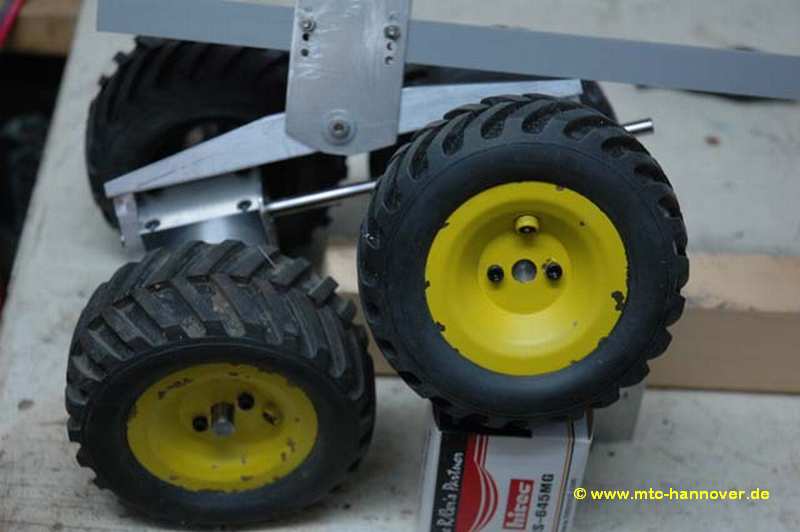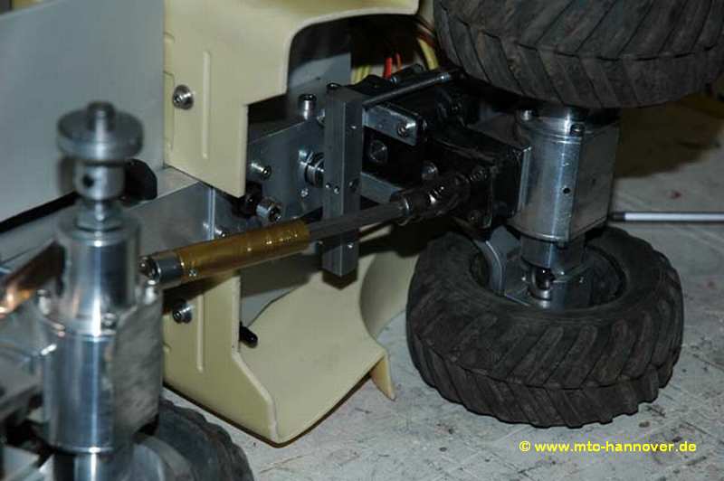 Thema Lenkung: Im ersten Wurf habe ich ein digitales Lenkservo von Hitec (HS-5955TG mit 17kg bei 4,8V) eingebaut. Das Servo hatte seinen Platz in einem Hilfsrahmen direkt an und vor der Lenkachse gefunden. Im Zuge des neuen Zwischengetriebes mit dem Motor auf der Achse ist das Lenkservo in den Hauptrahmen hinter die Achse umgezogen. Zum Lenken war das Servo trotz der beachtlichen Werte zu schwach, hatte aber dennoch genug Kraft, um die Lenkhebel aus 2mm starkem Alu zu verbiegen. Das Servo war auch eigentlich nicht zu schwach, aber die Stromversorgung. Trotz externem BEC, das bis zu 8A liefern können sollte, brach die Stromversorgung immer wieder kurzzeitig zusammen und die Fahrzeiten wurden aufgrund des gefrässigen Servos immer kürzer und unberechenbarer. So wurde das Lenkservo kurzerhand durch einen RB35-Getriebemotor mit der Untersetzung 1:600 in Kombination mit einem Servonaut MFR ersetzt. Bei geringem Stromverbrauch sind jetzt genügend Lenkkräfte vorhanden, die Räder in jeder Situation zu bewegen...die Lenkhebel sind jetzt übrigens aus 5mm starkem Aluminium und verbiegen nicht mehr so leicht - dafür lösen sich die Schrauben