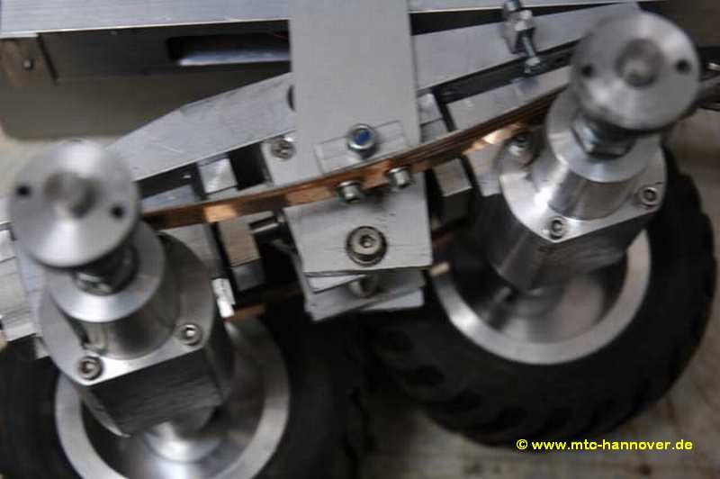Ursprünglich sollte ein Kunsstoff-Rahmen in den Abmessungen 30 breit und 20 hoch als U-Profil zum Einsatz kommen. Im ersten Wurf ist es aber ein Alu-Profil mit gleichen Abmessungen geworden. Die VA ist starr am Rahmen montiert, so dass weder Lenkkräfte verloren gehen noch das FH unnötig hoch montiert werden muss. Die beiden Hinterachsen sind derzeit sowohl quer als auch längs pendelnd aufgehängt. Eigentlich wollte ich das alles ohne Federung realisieren, aber die Praxis hat gezeigt: das geht so nicht. So ist die Pendelei mit Blattfedern aus Federbronze und Sägeblättern ausgerüstet worden, die dem Fahrzeug in der Querachse Stabilität geben. Zu dem sind die Ausschläge der Pendeleien sowohl quer als auch längs auf ca 15 Grad begrenzt worden. Und das ist noch mehr als genug!
